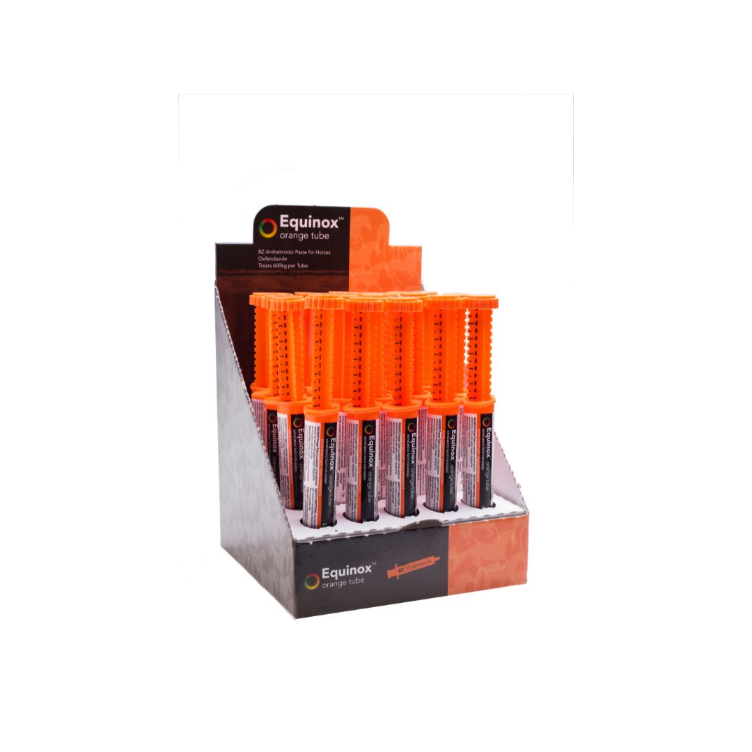 For the control of: large strongyles (bloodworm), small strongyles (red worm), ascarids (roundworms), pinworms, hairworms, stomach worms and a reduction in the prevalence of associated colic could be expected. Treats 600kg bodyweight. Equinox comes in a distinctive orange tube.